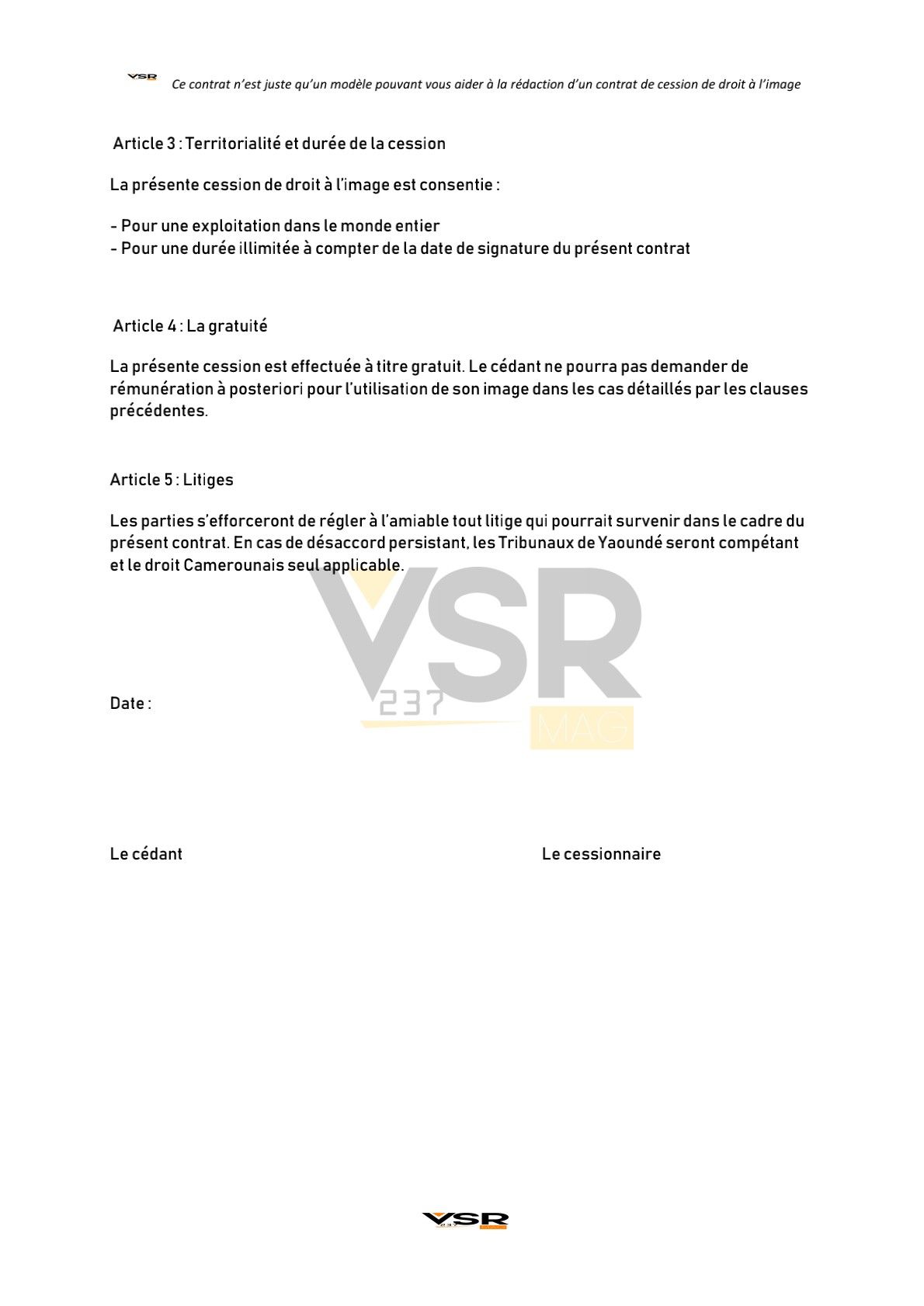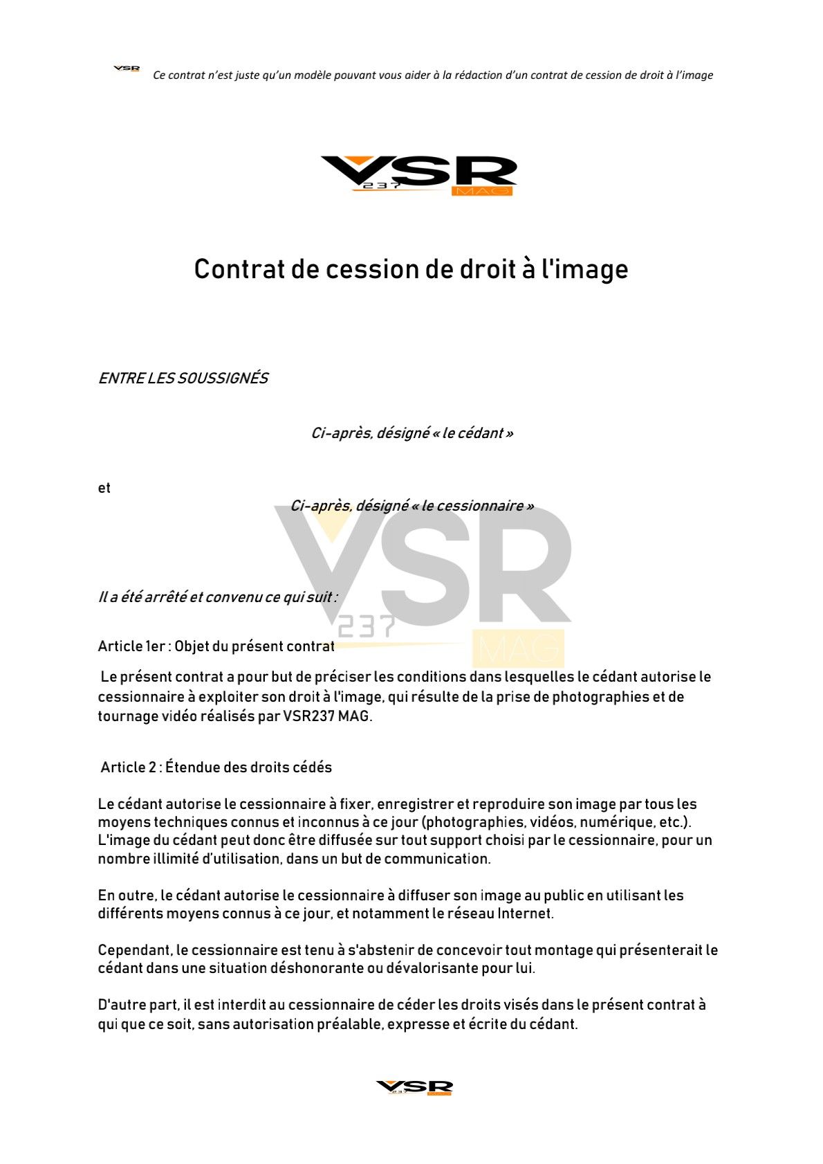 CONTRAT DE CESSION DE DROIT À L'IMAGE